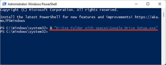 Se você está se perguntando o que está acontecendo aqui, bem, digitando o símbolo de e comercial (&), o PowerShell entende que precisa executar o programa. Caso contrário, o PowerShell tratará o comando como uma string e não invocará o arquivo.exe.