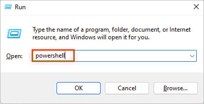 Pressione Windows + R, digite powershell e pressione Ctrl + Shift + Enter para iniciar o PowerShell como administrador.
