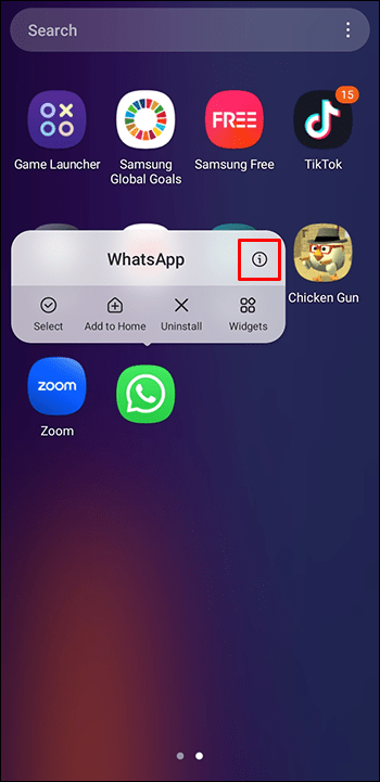Pressione e segure o aplicativo WhatsApp até que um pop-up apareça a janela é exibida.