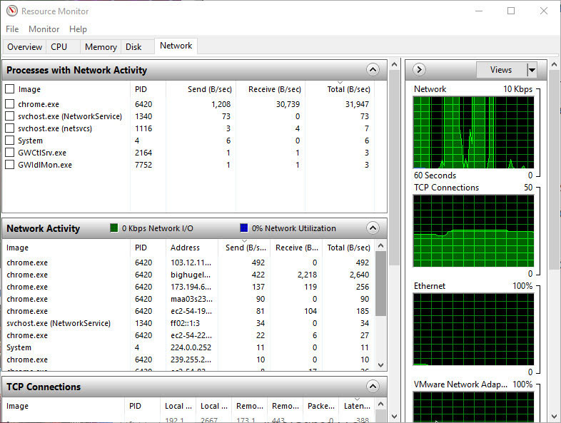 Esta ferramenta de monitoramento de rede do Windows pode fornecer uma visão abrangente de coisas como atividade de rede completa, processos com atividade de rede, conexões TCP ativas e uma lista de todas as portas de escuta. Se você é um usuário doméstico geral, o Monitor de recursos é tudo o que você precisa.