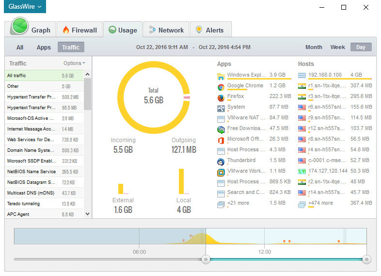 GlassWire é um monitor de sistema e um firewall ao mesmo tempo. O bom do GlassWire é que ele permite que você visualize toda a atividade da rede e separe-a de acordo com os aplicativos, tipo de tráfego e localização geográfica.