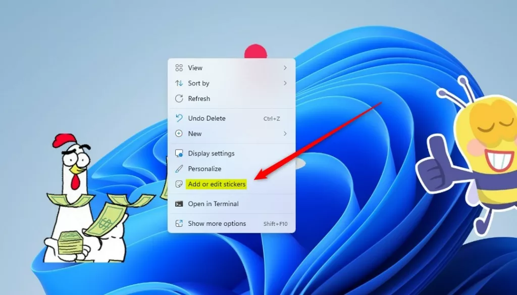 Adicionar e editar adesivos use o mesmo comando no menu de contexto. Para fazer isso, clique com o botão direito do mouse em uma área vazia da área de trabalho e selecione Adicionar ou editar adesivos.