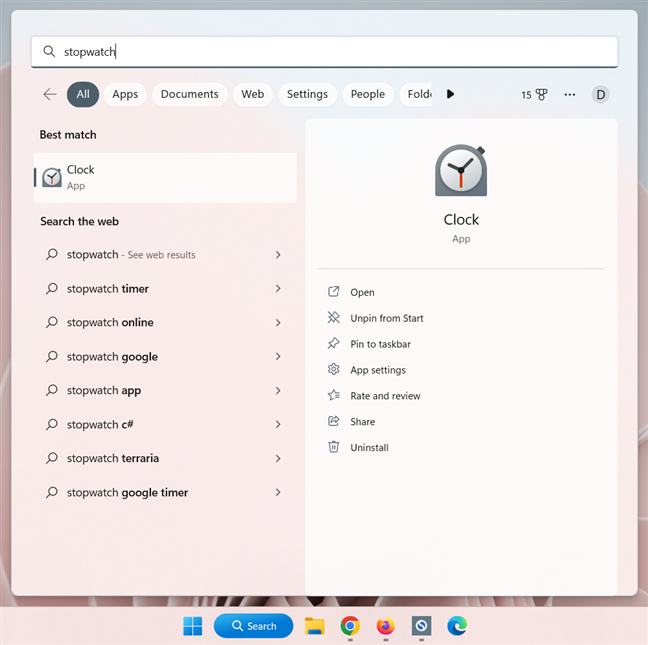 Como alternativa, no Windows 11, você também pode digitar cronômetro na janela Pesquisar e clicar ou tocar no botão Aplicativo de relógio.