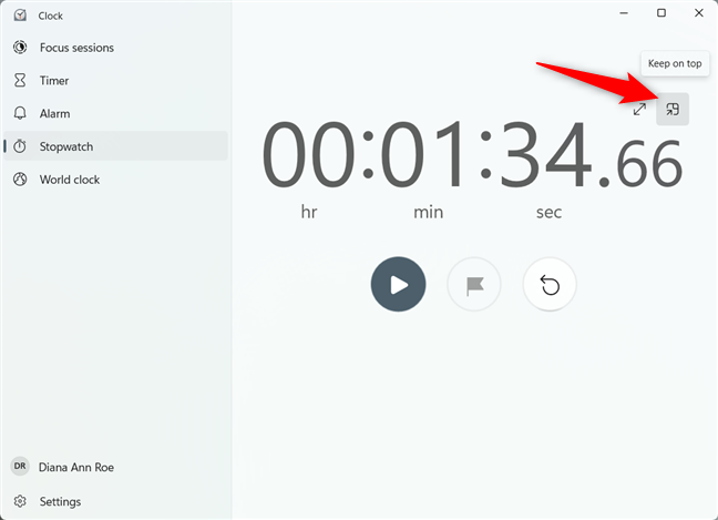 O botão”Manter no topo”no canto superior direito, ao lado de Expandir, ajuda você a ficar de olho no cronômetro constantemente. Clique ou toque nele.