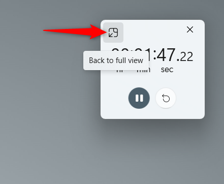 A janela do Relógio é focada no cronômetro e seu tamanho é reduzido. Você pode redimensioná-lo ou movê-lo como quiser, e ele sempre é exibido no topo de outros aplicativos. Clique ou toque em”Voltar à visualização completa”para retornar ao modo de visualização normal.