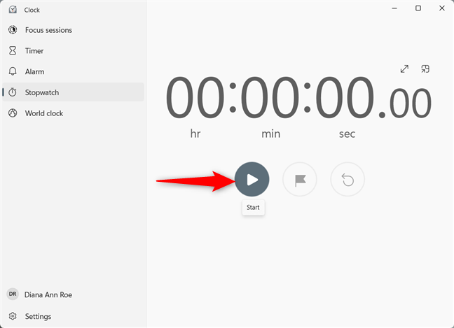 O cronômetro do Windows é muito fácil de usar. Ao contrário dos alarmes e cronômetros disponíveis no aplicativo Windows 10 e Windows 11 Clock, você obtém apenas um cronômetro e não pode adicionar mais. Use o grande botão Iniciar mostrando o símbolo Reproduzir para iniciar o cronômetro.