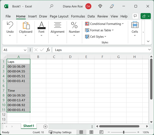 As voltas e o tempo (divisões) quando colados em um Excel documento