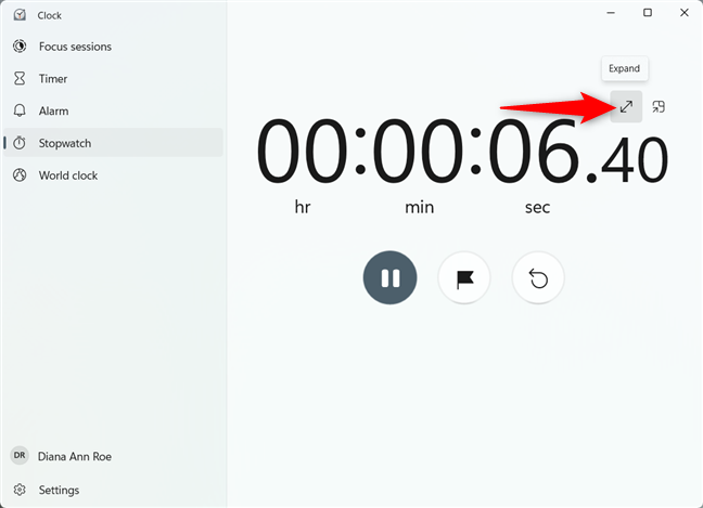 Se quiser ficar de olho no cronômetro de longe, use o botão Expandir, que se parece com uma seta de duas pontas.