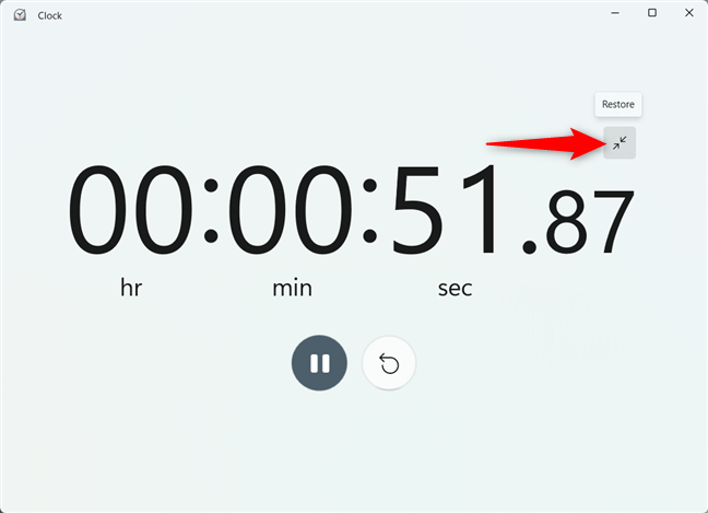O cronômetro se expande para ocupar toda a janela do Relógio. Clicar ou tocar no botão Restaurar retorna tudo ao normal.