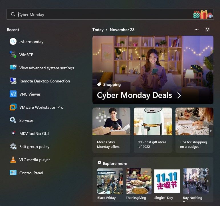Com as atualizações recentes, a Microsoft adicionou um novo recurso ao menu Iniciar e à barra de tarefas chamado Destaques de pesquisa. Agora, ao contrário do que você pensa, esse recurso não destaca arquivos ou aplicativos locais. Em vez disso, ele tenta destacar o conteúdo da pesquisa online e mostrar anúncios e sugestões. Por exemplo, abri recentemente a pesquisa na barra de tarefas e ela imediatamente mostrou as ofertas da Cyber Monday.