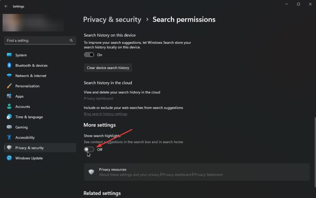 Depois de abri-lo, clique na opção”Privacidade e segurança”na barra lateral. Em seguida, role para baixo à direita página e desative a opção”Mostrar destaques de pesquisa”.