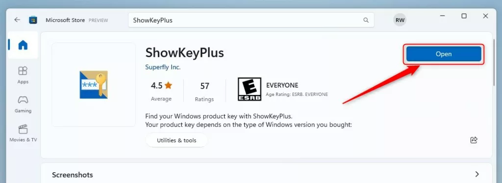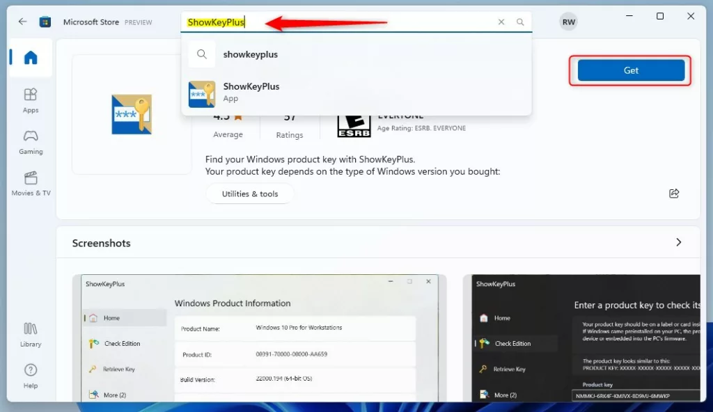 Quando o aplicativo da Microsoft Store abrir, use a caixa de pesquisa para procurar por “ShowKeyPlus“conforme destacado abaixo.