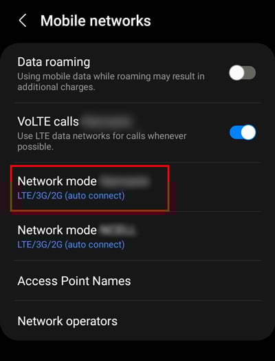 Abra o menu de configurações do telefone. Vá para Conexões. Toque em Redes móveis. Em seguida, toque em Modo de rede.