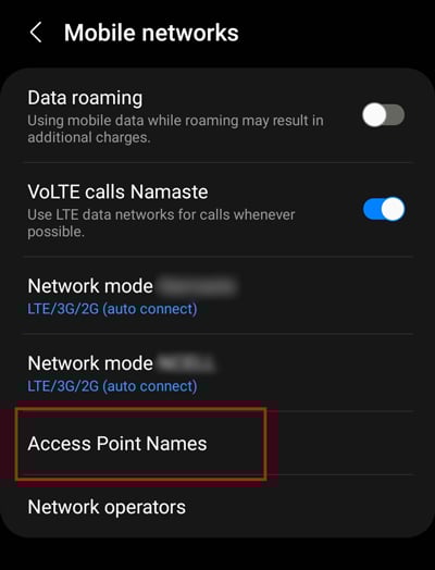 Inicie as configurações do telefone. Vá para Conexões. Toque em Redes móveis. Toque em Selecionar Nomes dos pontos de acesso.