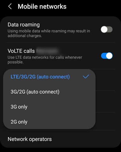 Você pode alternar seu modo de rede para LTE ou 4G para uma melhor velocidade de dados, dependendo do modelo do seu dispositivo.