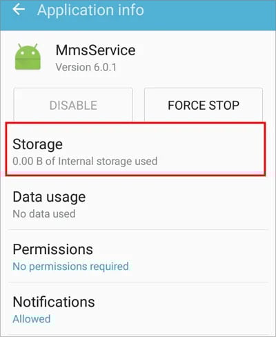 Procure MmsService e abra isto. Toque em Armazenamento.