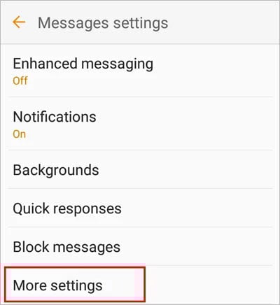 Inicie o aplicativo de mensagens. Toque em Mais no canto superior direito. Em seguida, toque em Configurações.