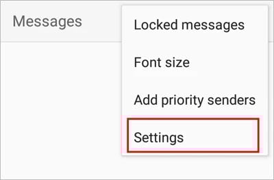 Inicie o aplicativo de mensagens. Toque em Mais no canto superior direito. Em seguida, toque em Configurações.