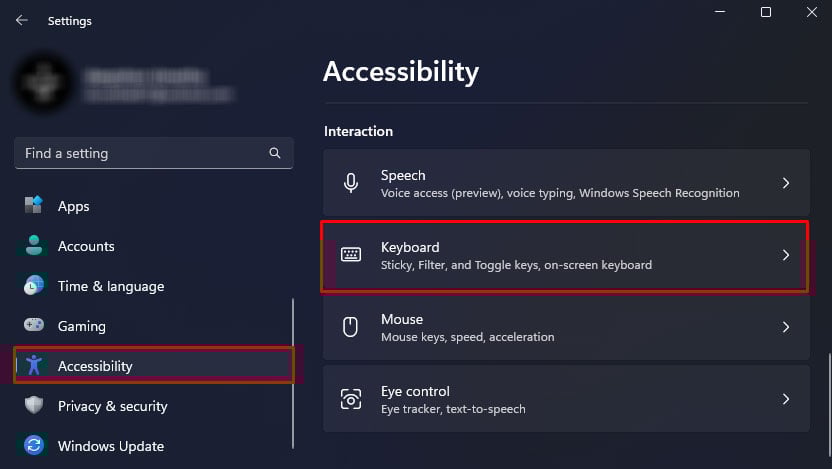 Pressione a tecla Windows + I para abrir Configurações. Navegue até Acessibilidade > Teclado.