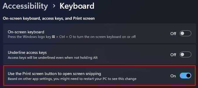 Role para baixo até Teclado na tela, teclas de acesso e tela de impressão. Ative Use o botão Imprimir tela para abrir o recorte de tela.