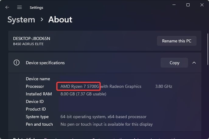 Nas Especificações do dispositivo, verifique as informações do processador junto com sua geração.