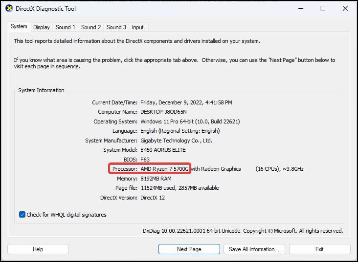 A ferramenta de diagnóstico Direct X fornece um breve resumo do dispositivo e também auxilia na solução de problemas com a tela, som e entradas.