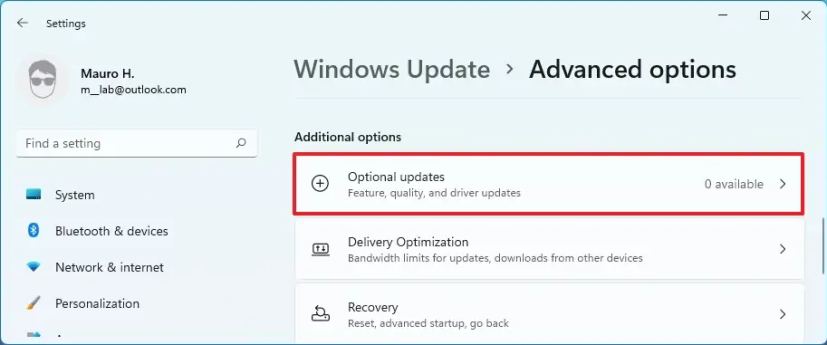 Na seção “Avançado opções”, clique na página Atualizações opcionais à direita.