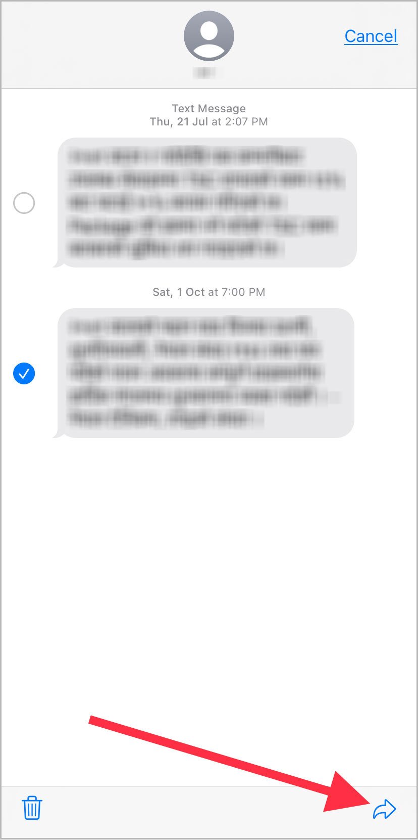 Abra qualquer mensagem de texto e pressione e segure qualquer texto. Toque em Mais. Selecione os textos desejados e toque na opção Compartilhar . Selecione todo o texto no campo de texto e toque em Compartilhar novamente no menu adicional.