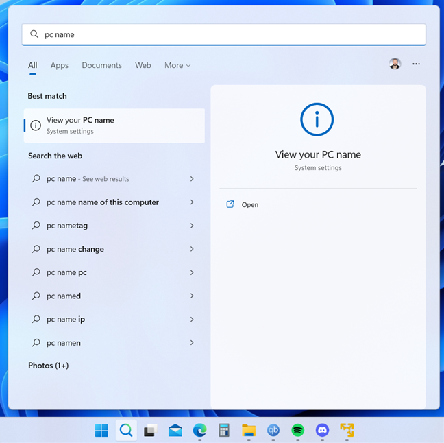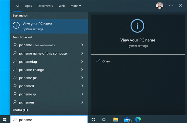 Você também pode usar a barra de pesquisa no Windows 10. Clique ou toque no campo de pesquisa e procure por “nome do computador”. Em seguida, abra o resultado “Ver o nome do seu PC”.
