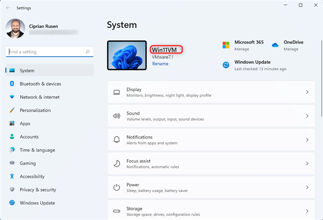 Veja o nome do computador na parte superior das configurações do Windows 11