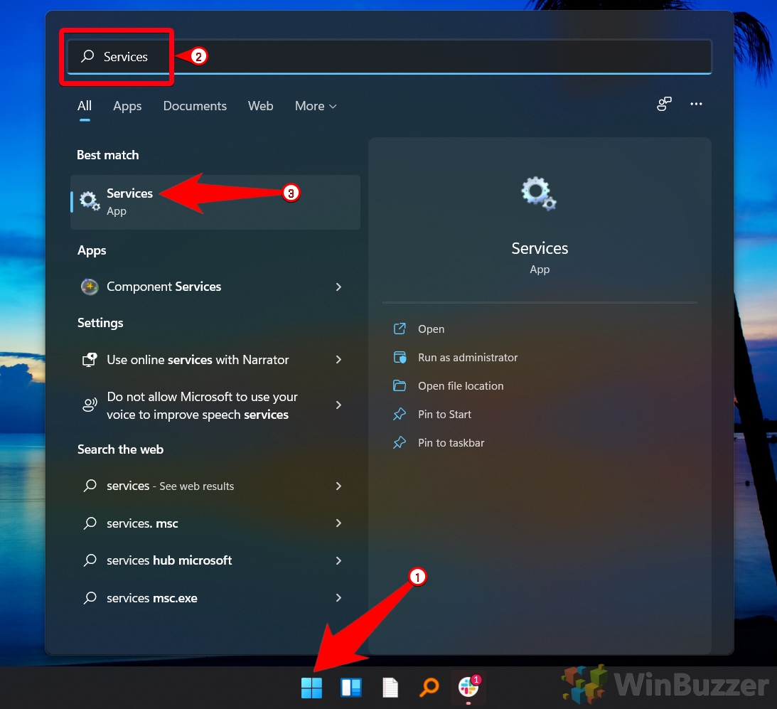 Clique no ícone”Windows”, digite”Serviços”e selecione”Serviços”no resultado