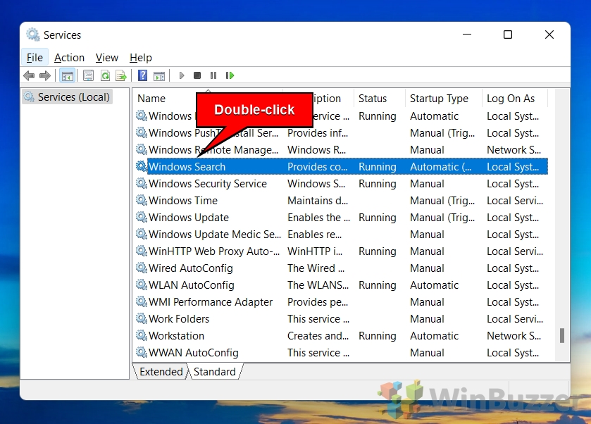 Na caixa de diálogo”Serviços”, clique duas vezes em”Pesquisa do Windows”para abrir suas propriedades