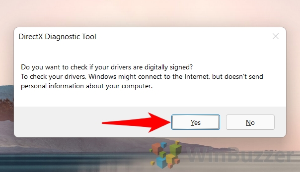 Na caixa de diálogo”DirectX Diagnostic Tool”, clique em”Yes”