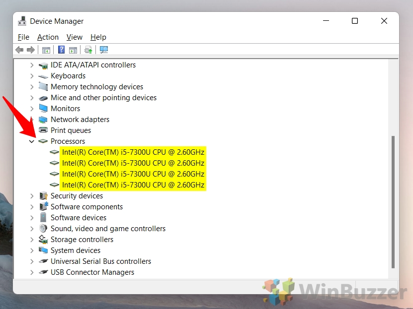 O Gerenciador de dispositivos mostrará cada Núcleo da CPU como uma única entrada para que você saiba quantos núcleos sua CPU tem.