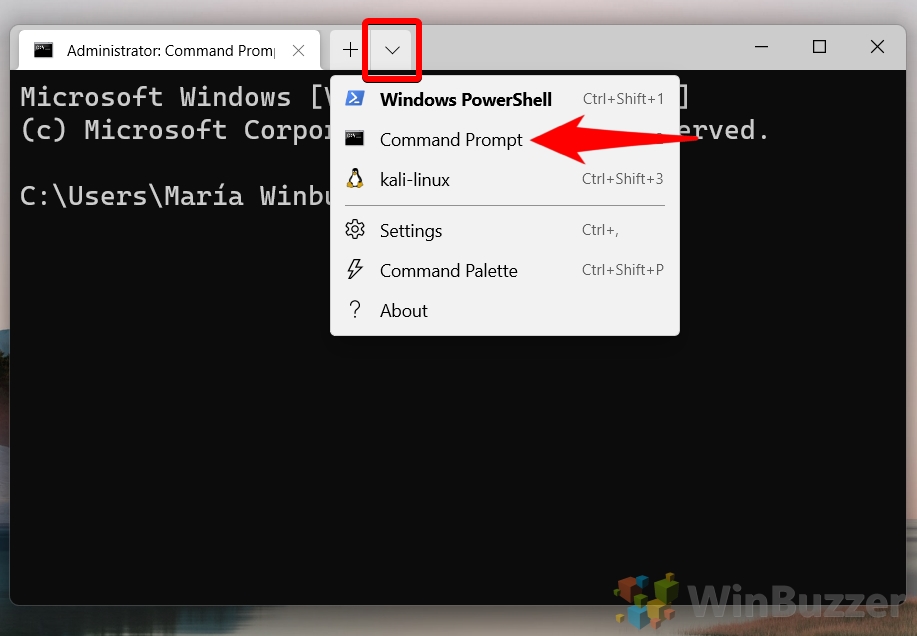Clique no ícone”Dropdown”e selecione”Prompt de comando”nas opções
