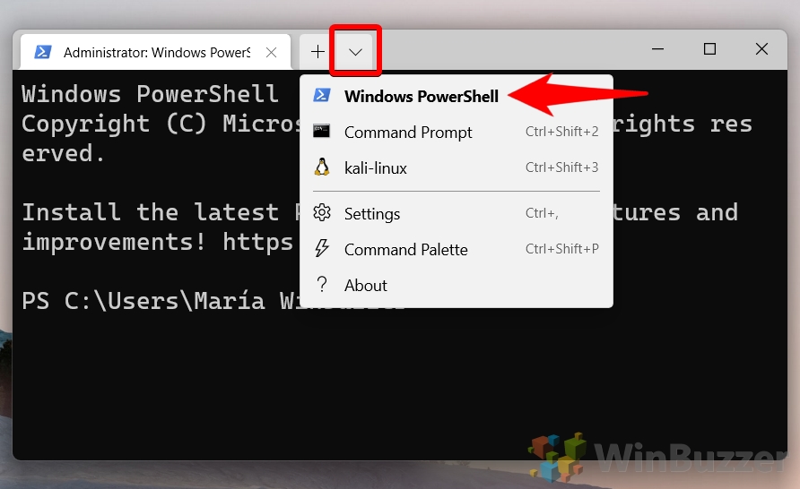 Clique no”Dropdown”e selecione”Windows PowerShell”nas opções