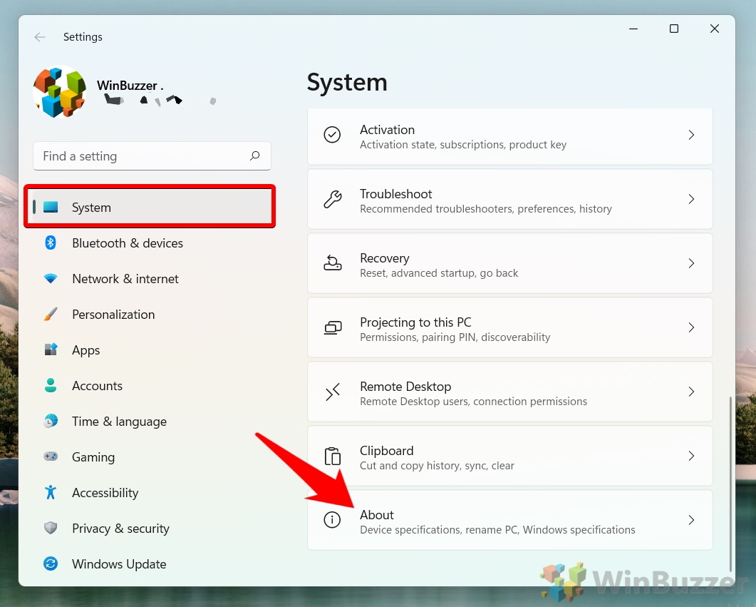 Selecione”Sistema”na barra lateral e clique em”Sobre”para verificar os detalhes do dispositivo
