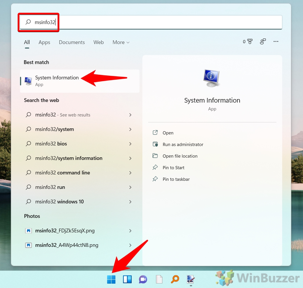 Clique no ícone”Windows”, digite”msinfo32″e selecione”Informações do sistema”no resultado