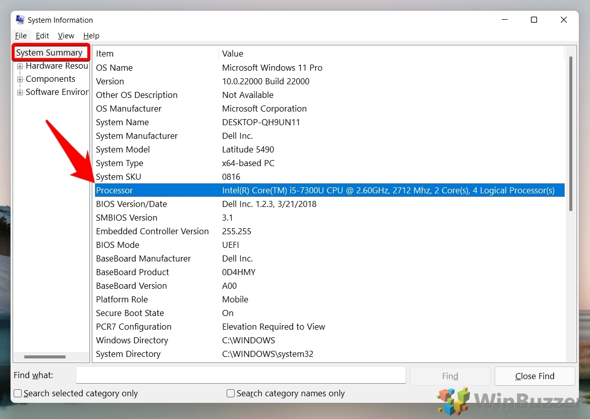 Selecione “System Summary” na barra lateral e confira os detalhes do processador ao lado do item”Processador”
