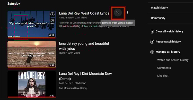 Agora, destaque o vídeo e clique no ícone X para removê-lo do histórico de exibição.
