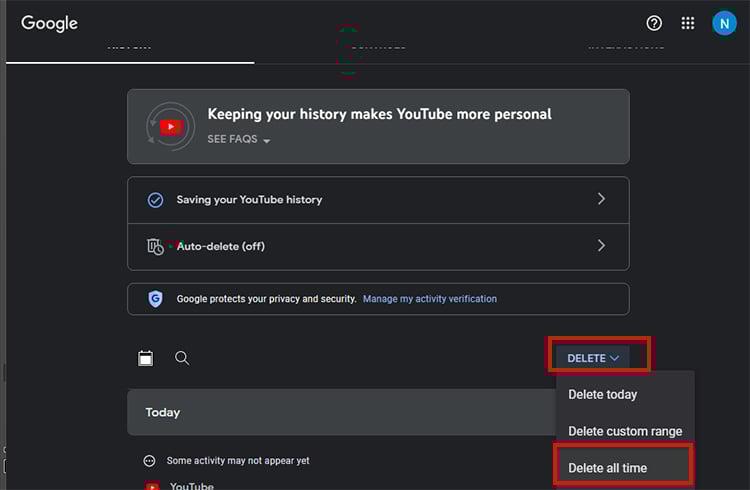 Todas as suas atividades no YouTube são salvas em sua conta do Google. Portanto, a maneira mais rápida de limpar todo o seu histórico do YouTube é em”Minha atividade”. Para usuários de aplicativos móveis, você pode excluí-los de Histórico e privacidade.