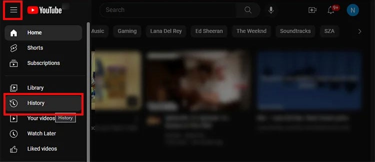 Inicie o site YouTube. Faça login em sua conta. Clique no menu Três linhas horizontais no canto superior esquerdo. Escolha Histórico.
