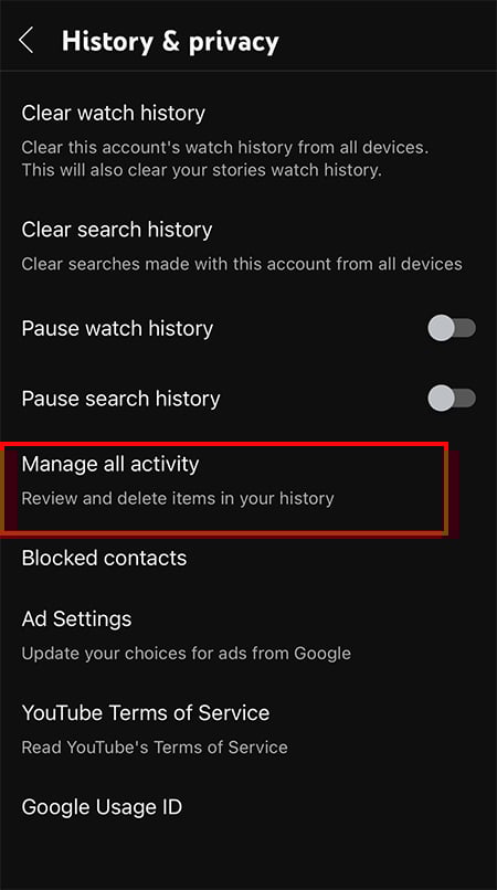 Todas as suas atividades no YouTube são salvas em sua conta do Google. Portanto, a maneira mais rápida de limpar todo o seu histórico do YouTube é em”Minha atividade”. Para usuários de aplicativos móveis, você pode excluí-los de Histórico e privacidade.