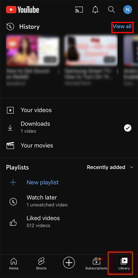 Abra o YouTube e faça login. No canto inferior direito, toque no ícone Biblioteca . Ao lado de Histórico, escolha Exibir tudo.