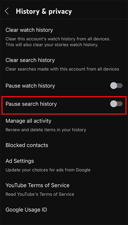 Novamente, deslize o botão de alternância para a direita para Pausar histórico de pesquisa para ativá-lo. Toque em Pausar para confirmar.