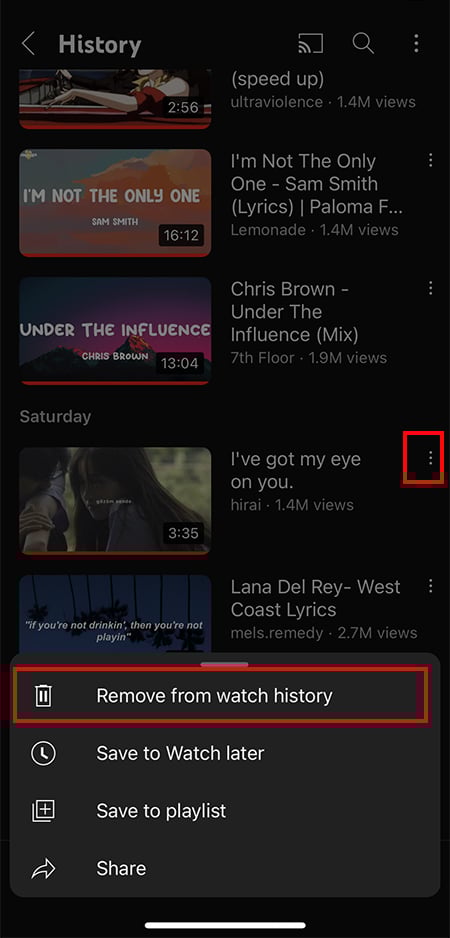 Destaque o vídeo e toque no ícone Três pontos mais. Escolha Remover do histórico de exibição.