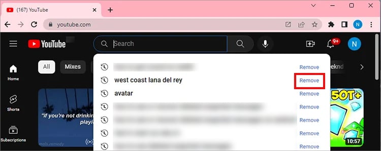 Inicie o site YouTube . Navegue até a barra de pesquisa e clique nela. Escolha Remover ao lado do histórico de pesquisa.