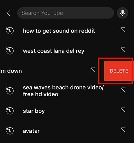 No iOS, realce o vídeo na Lista de pesquisa. Deslize para a esquerda e toque em Excluir.