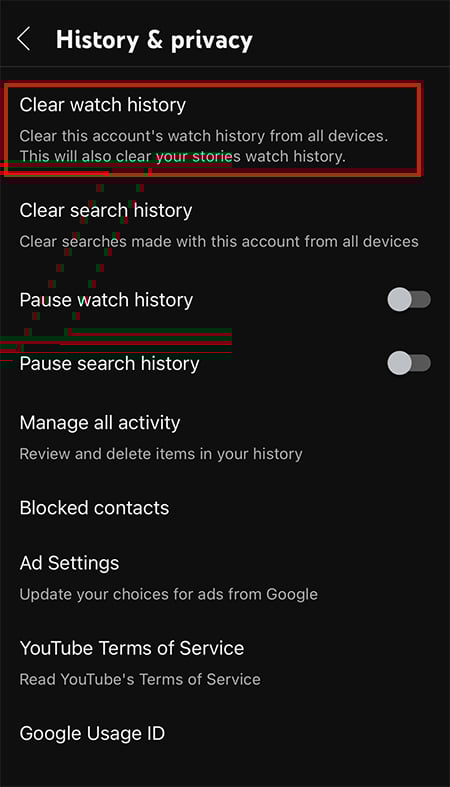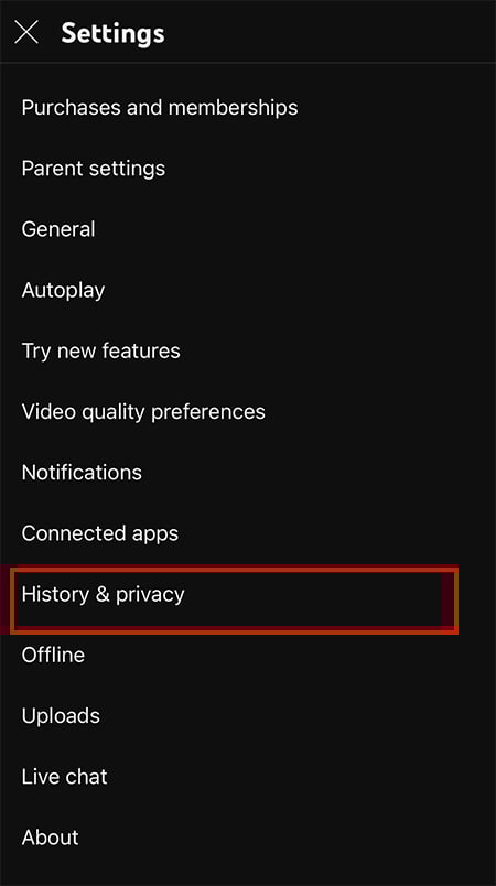 Abra o aplicativo YouTube e assine em sua conta. Toque no ícone do seu Perfil no canto superior direito. Escolha Configurações > Histórico e privacidade.