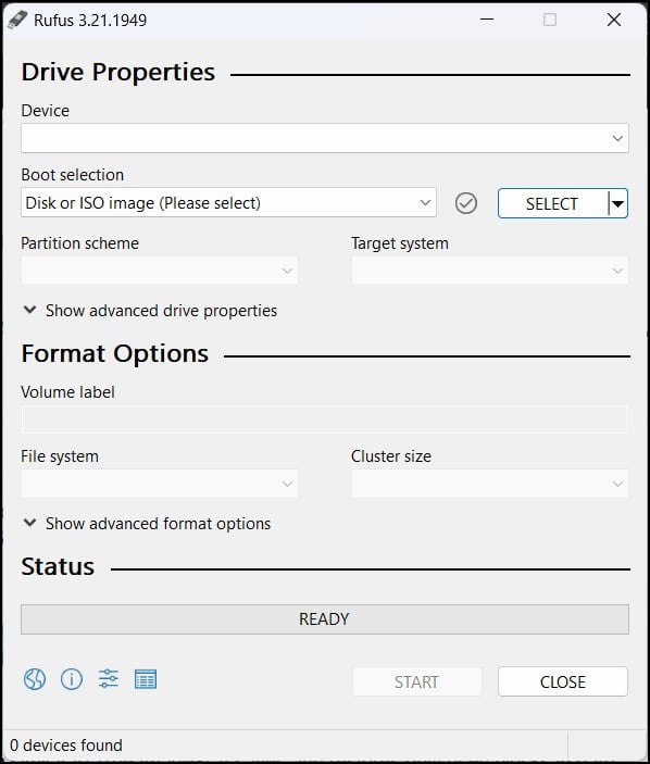 Faça o download e instale o Rufus. Agora conecte a unidade USB ao computador. Certifique-se de que a unidade USB esteja vazia ou que o conteúdo dentro dela tenha um backup. Abra o software Rufus.